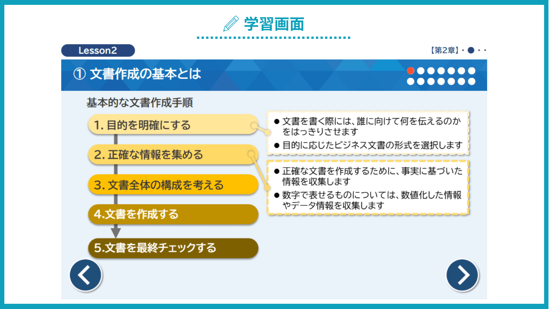 普段のコミュニケーションとの違いや、文書作成のときに気を付けるポイントを学習します。