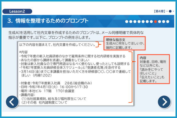 最低限のビジネス文書の基礎を踏まえたうえで生成 AI を活用していきます。より効率的に、正確に文書を作成する方法を学びます。