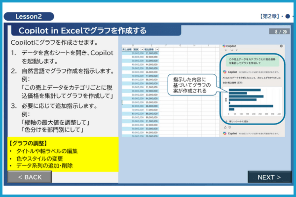 ここではCopilotをメインに、生成AIに関する基礎知識の習得に加え、Copilot導入の具体的なメリット、主要機能の操作方法、そして業務現場での活用事例を体系的に学習します。