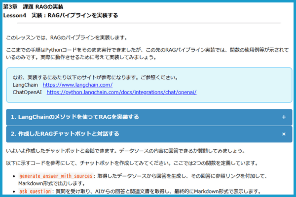 実際にコードを使って、RAGチャットボットを構築する課題にも挑戦! 「どう使えばいいか」がわかり、業務にも具体的に活かせる内容です。