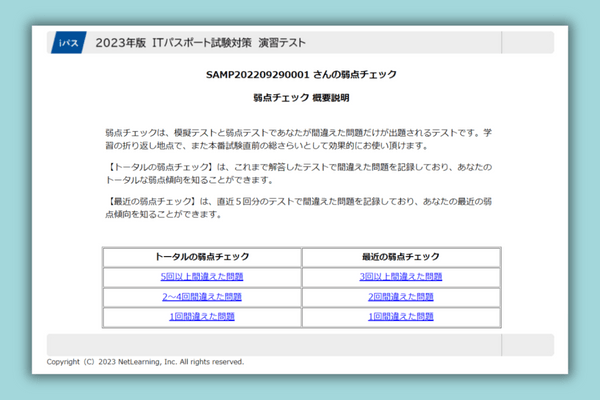 過去問題を解く徹底演習コースでは、ご自身の弱点傾向をつかむことができるチェックシステムが搭載されています。テストの解答データが蓄積され、特に苦手な問題を把握できます。間違えた問題だけを復習できるので、効率的に弱点克服が可能です。