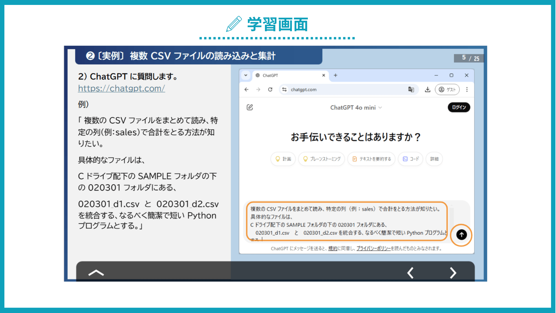 第1章 Lesson2 で触れた Python や ChatGPT でできるプログラムを前提に、複数 CSV ファイルの読み込みと集計、ファイル名の一括修正について学習します。