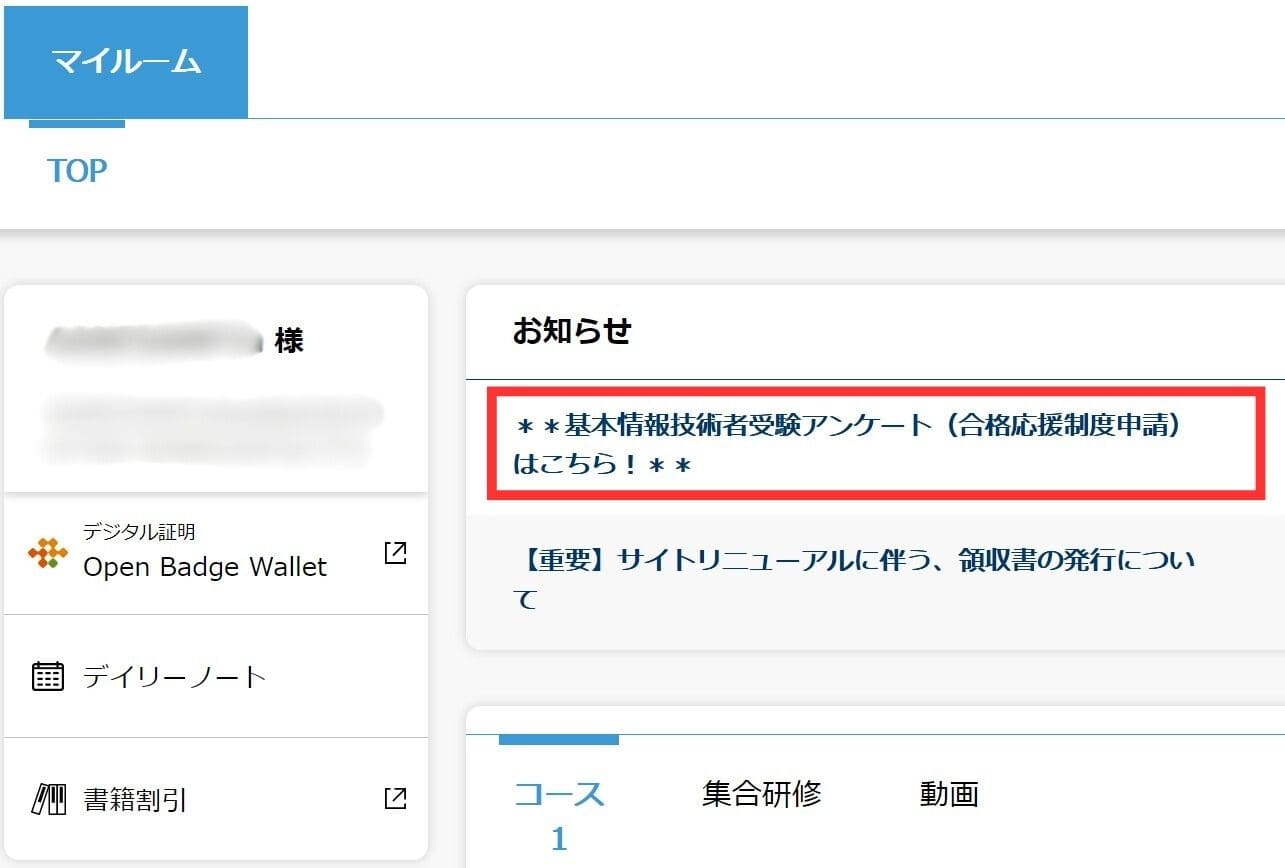 2.「お知らせ」の『**基本情報技術者受験アンケート***』をクリックしてください。