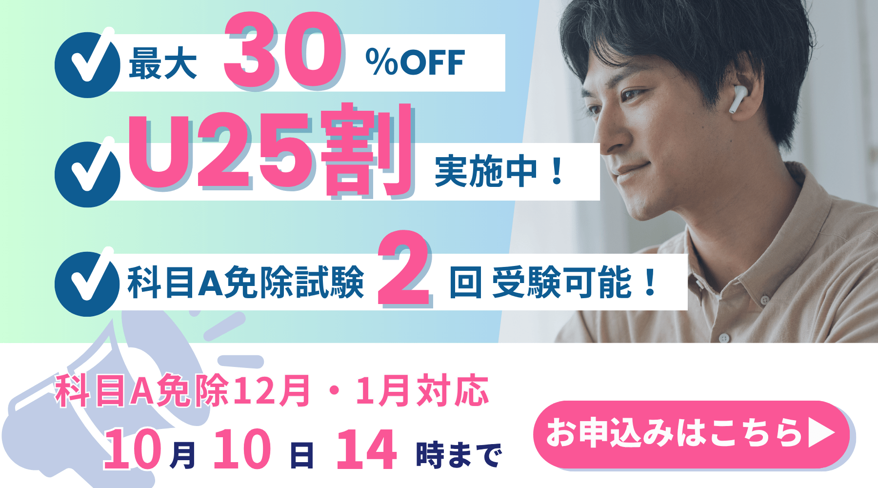 現在お申込いただくと、12月・1月の科目A免除試験を受験いただけます。最大2回受験可能です。 - 25歳以下限定割引!