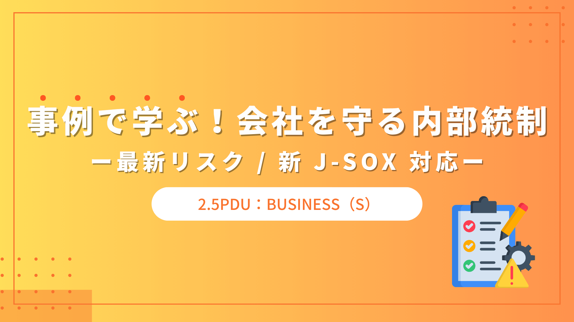- 事例で学ぶ!会社を守る内部統制 ― 最新リスク / 新 J-SOX 対応 ―(2.5PDU 取得:Business Acumen)